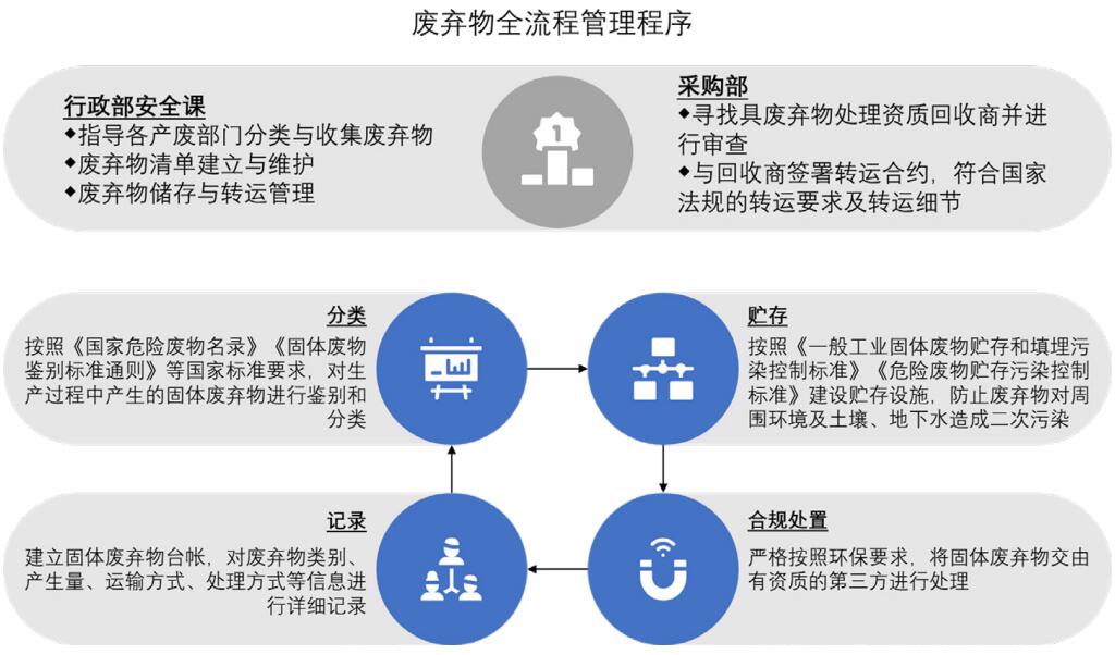 本集团严格遵守《中华人民共和国环境保护法》《中华人民共和国固体废物污染环境防治法》等法律法规,制定《废弃物管理程序》,明确“分类回收、集中保管、统一处理”的废弃物管理原则,对固体废弃物进行分类、贮存、合规处置及记录的全流程管控,以尽可能降低废弃物对周围环境的影响。