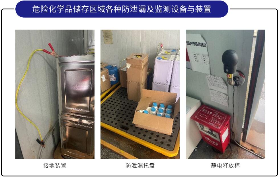 在危险化学品的储存区域均已配备各种防护、监测及防泄漏设备,例如 : 温度与湿度测量设备、有害气体探测器、静电释放器、防爆电气装置,以及洗眼器等等。为保障员工的健康与安全,我们持续向员工传达危险化学品危害信息和后续控制机制,并要求相关作业员工必须配戴公司所发放的个人防护装备。
