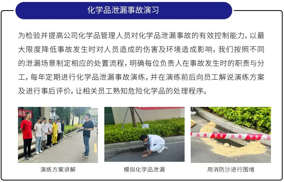此外,我们亦每年制定教育训练计划,对公司内涉及产生危险废物的部门人员开展培训课程,每年按照所建立的危险废弃物应急预案进行危险废弃物泄漏与火灾等情景的实操演练,确保员工在环境事故发生时,能够采取最安全有效的方法,减低对环境所带来的影响。